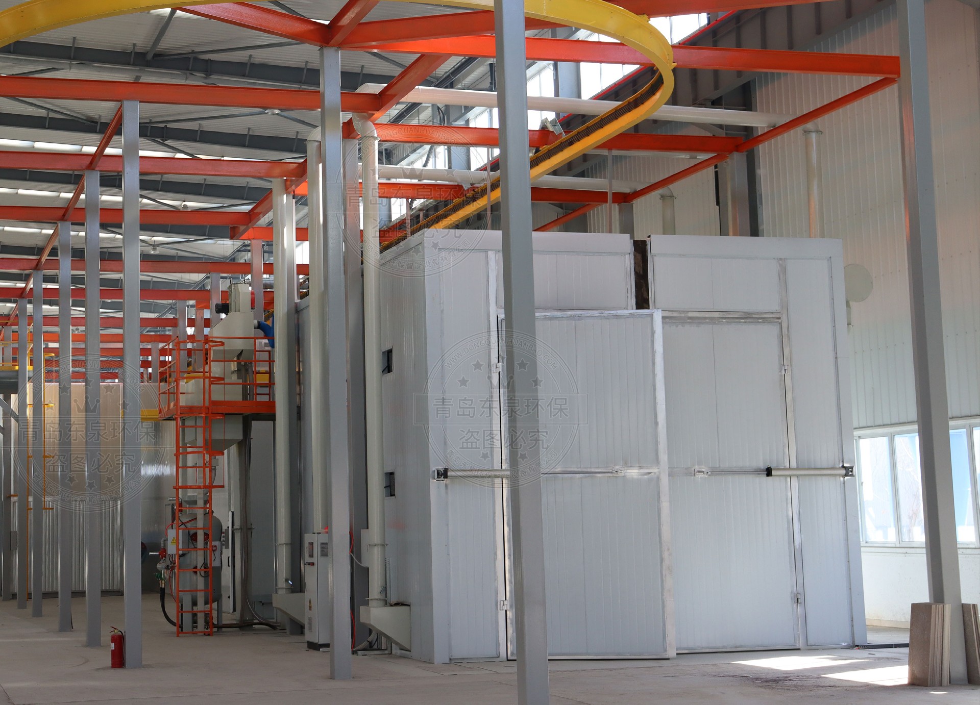 5)采用型鋼做室體框架,外面覆蓋50mm厚彩鋼夾芯板。室體內(nèi)部滿鋪1.5mm鋼板,減少鋼丸沖擊及損壞;內(nèi)襯3mm耐磨橡膠板,防止丸料對板壁的沖擊磨損,噴砂室兩端開門。在噴砂室體兩側(cè)各配置1個工作安全門,便于操作人員調(diào)整噴砂主機和對設備進行檢修及出現(xiàn)故障時安全撤離。在噴砂室側(cè)壁和大門上配置透明觀察窗。